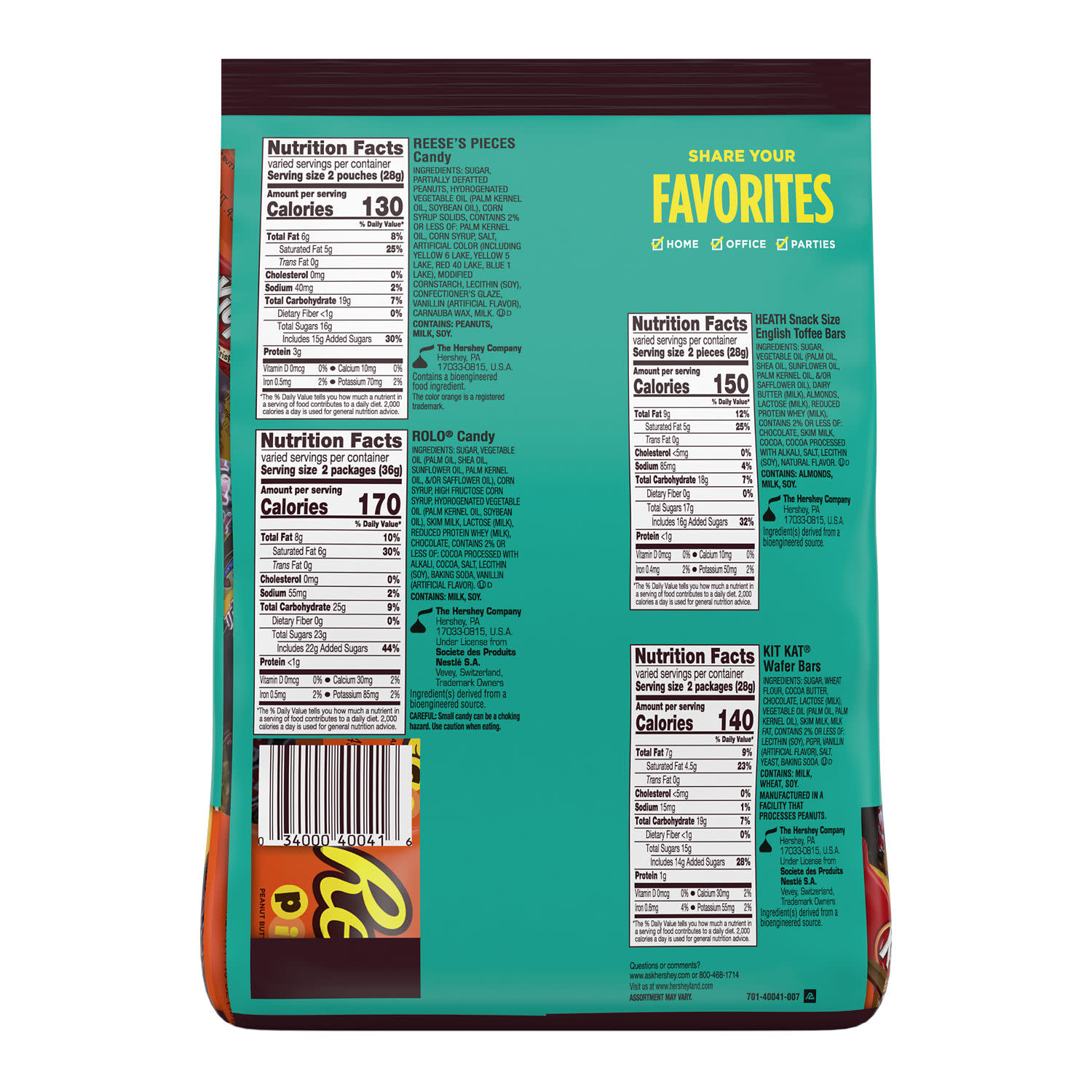 Includes HEATH chocolatey English toffee bars, REESE’S PIECES peanut butter candy, MILK DUDS chocolate caramel candy, KIT KAT milk chocolate wafer bars and ROLO rich chocolate caramel candy